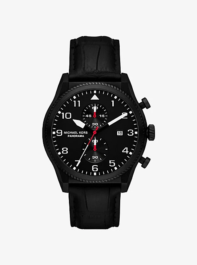 Oversized Panorama Black-Tone and Crocodile Embossed Leather Watch