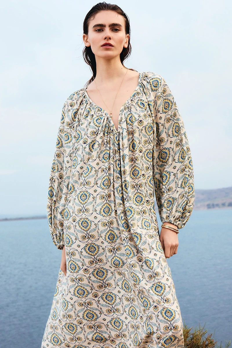 Long, oversized tunic dress in a woven viscose blend. Sweetheart neckline with bound edges and gathers. Narrow, removable tie belt at waist with embellished ends. Raglan balloon sleeves with narrow elastic at cuffs. Unlined.