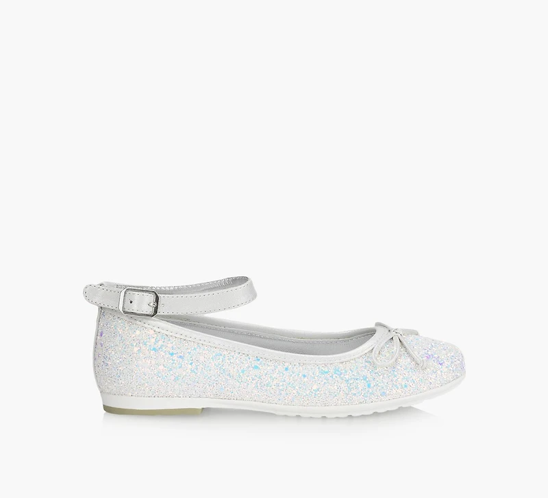 Passion is a dainty flat for growing feet. The classic ballerina silhouette is enhanced by a practical ankle strap for all-day wear and enough flair for the more special occasions. Finished with a glittery upper sealed with a bow on the toe.