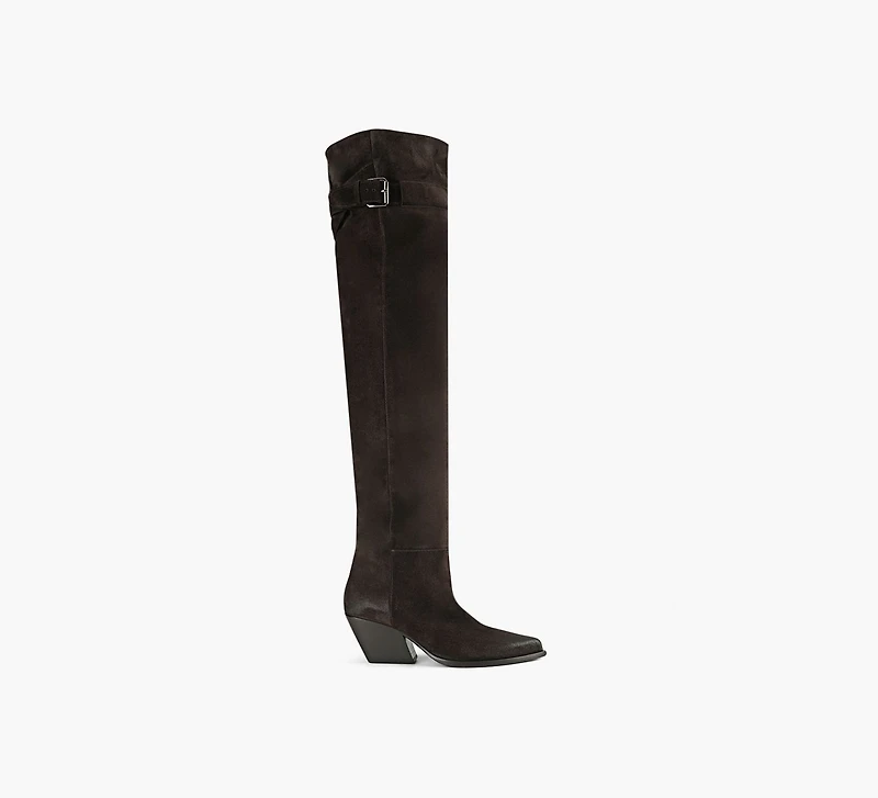 Elena Iachi is renowned for her Western-inspired creations, and the Pommery boot is proof. Taking notes from the silhouettes donned by cowboys of the Wild West, this pair features a razor-sharp pointed toe and a low heel. A sleek, buckle-adorned strap lace its cuff, cut to a knee-grazing height to keep your pins cosy in frosty temps.
