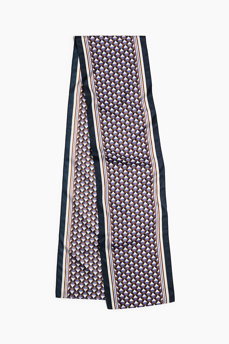 Long scarf in satin with a printed pattern. Wrap around hips for a stylish touch, use as a fun bag accessory, or as a classic neck detail.