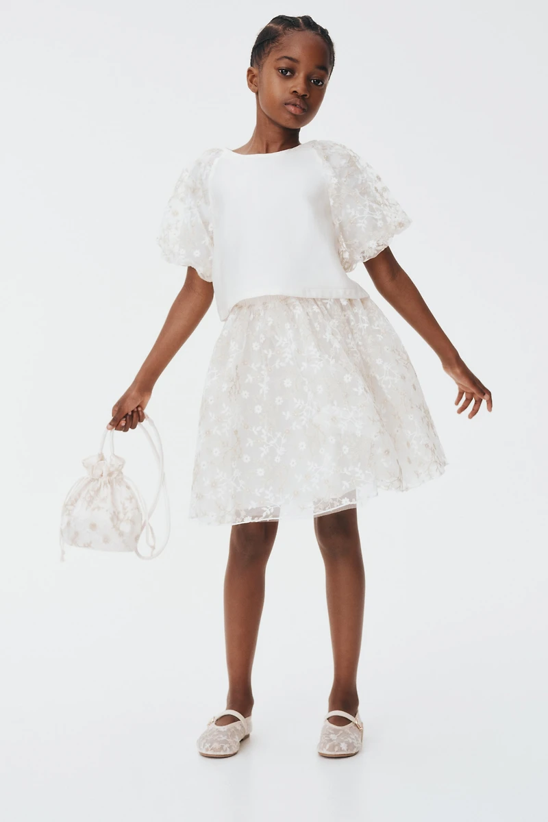 Blouse in soft woven fabric with a slight sheen. Round neckline, opening at back with a button, puff sleeves in embroidered tulle, and elasticized cuffs. Lined.