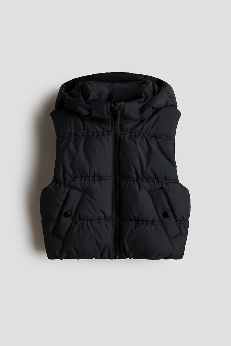 Padded vest with a detachable hood. Stand-up collar, zipper at front, and welt front pockets with snap fastener. Concealed elastic at hem. Lined.