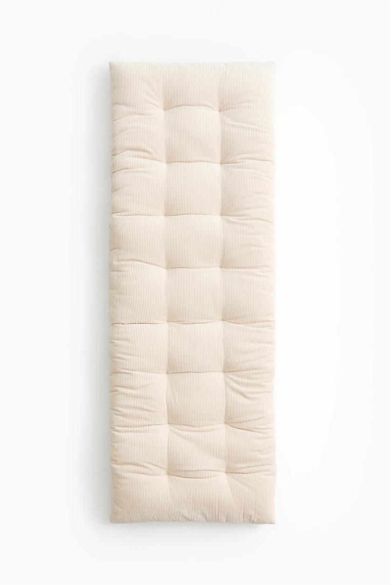 Large, padded seat cushion in cotton corduroy with tufting to retain shape. Perfect for a bench or daybed.