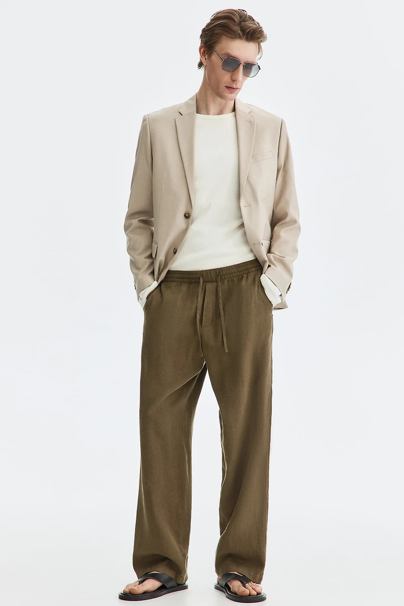Relaxed-fit pants in a soft, woven viscose and linen blend with a casual but not oversized silhouette. Drawstring and covered elastic at waistband, mock fly, diagonal side pockets, and a welt back pocket.