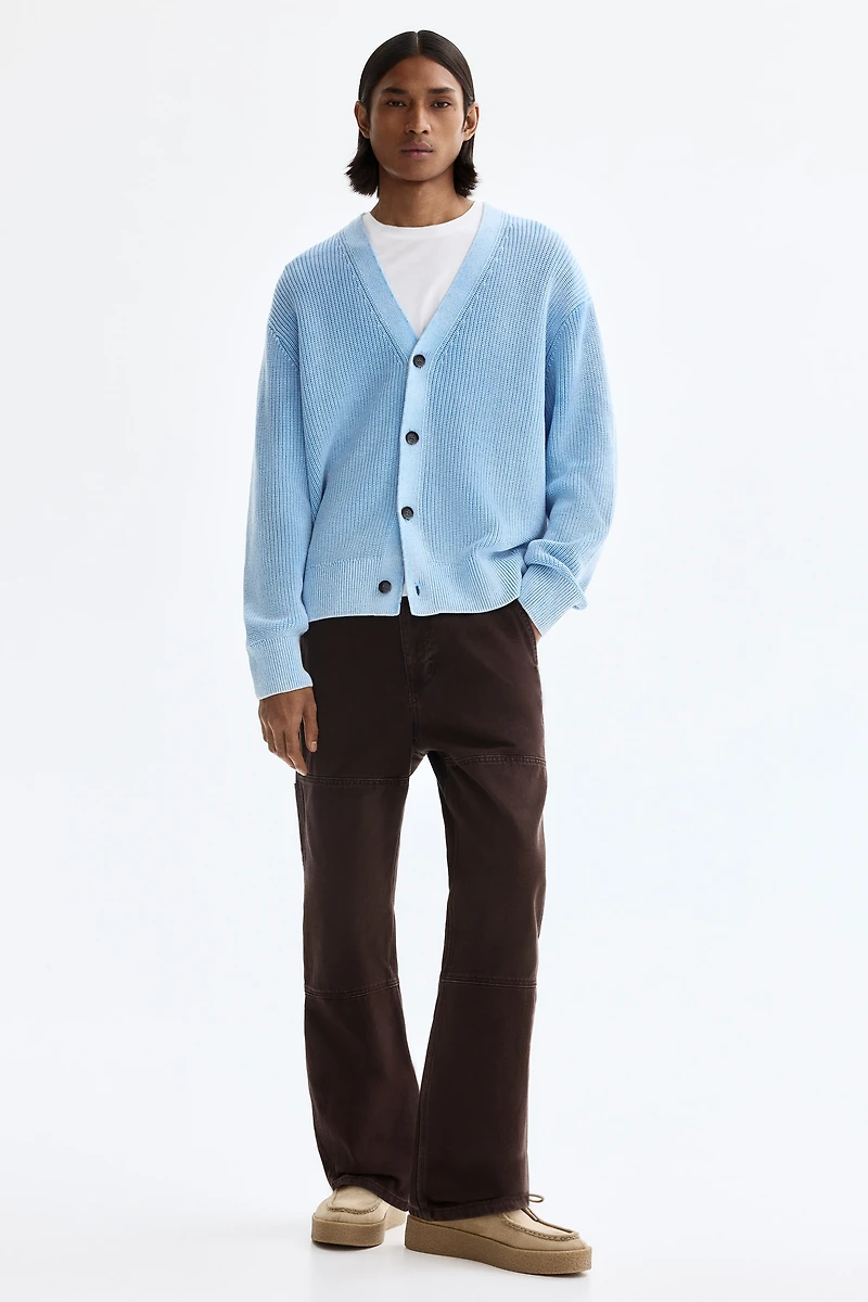 Relaxed-fit cardigan in rib-knit cotton with a casual but not oversized silhouette. Low-cut V-neck, buttons at front, and long sleeves. Ribbing at cuffs and hem.