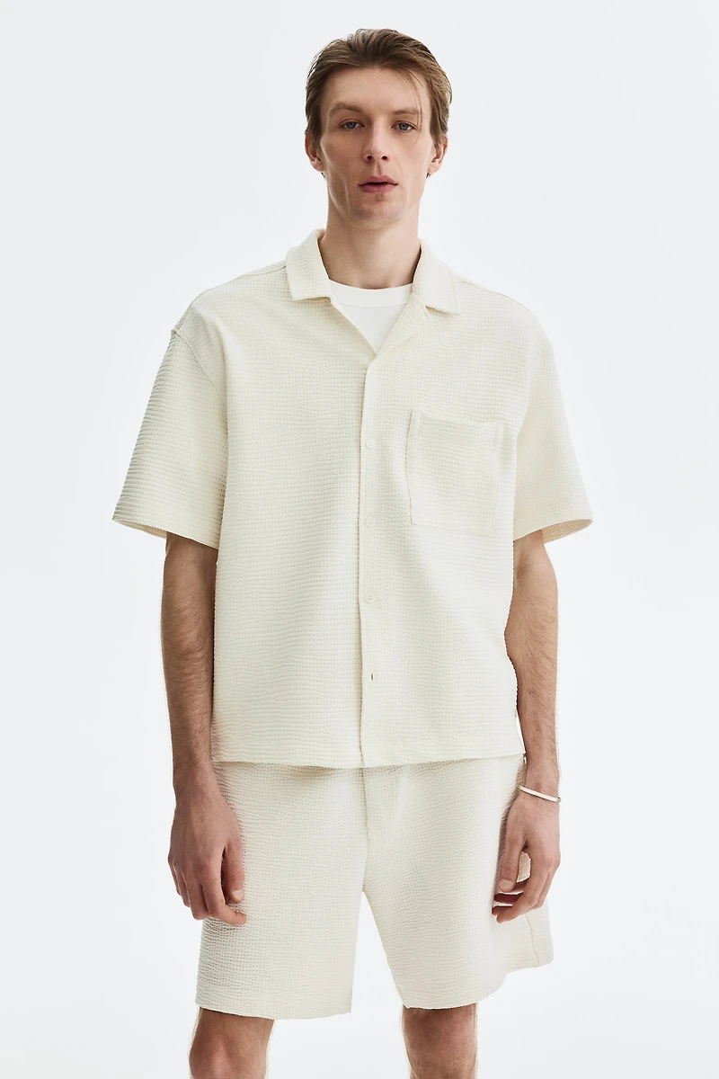Relaxed-fit shorts in waffled cotton-blend jersey with a casual but not oversized silhouette. Concealed drawstring and covered elastic at waistband, mock fly, diagonal side pockets, and a patch back pocket.