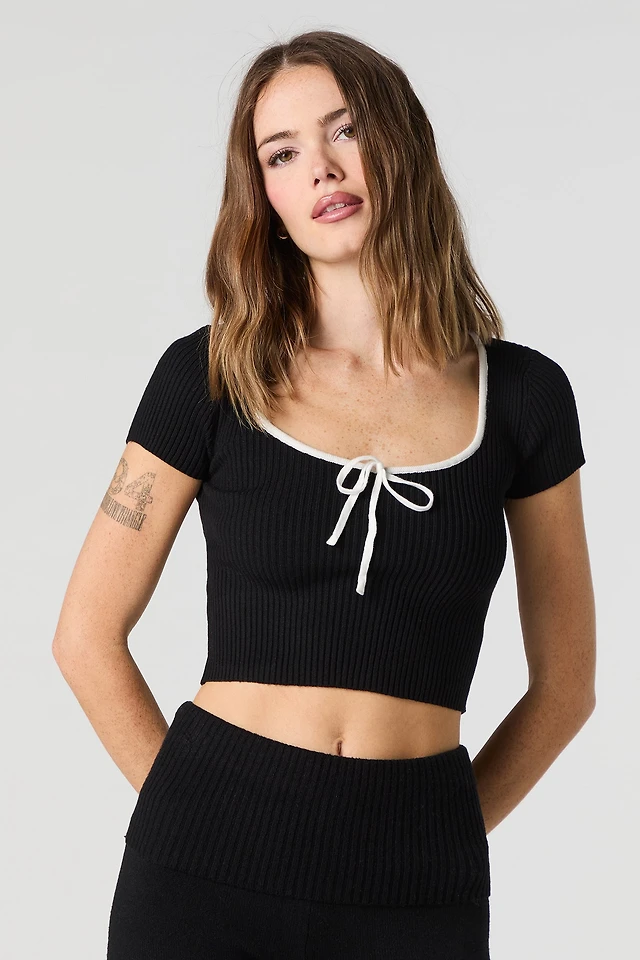 Ribbed Knit Contrast Trim Short Sleeve Sweater