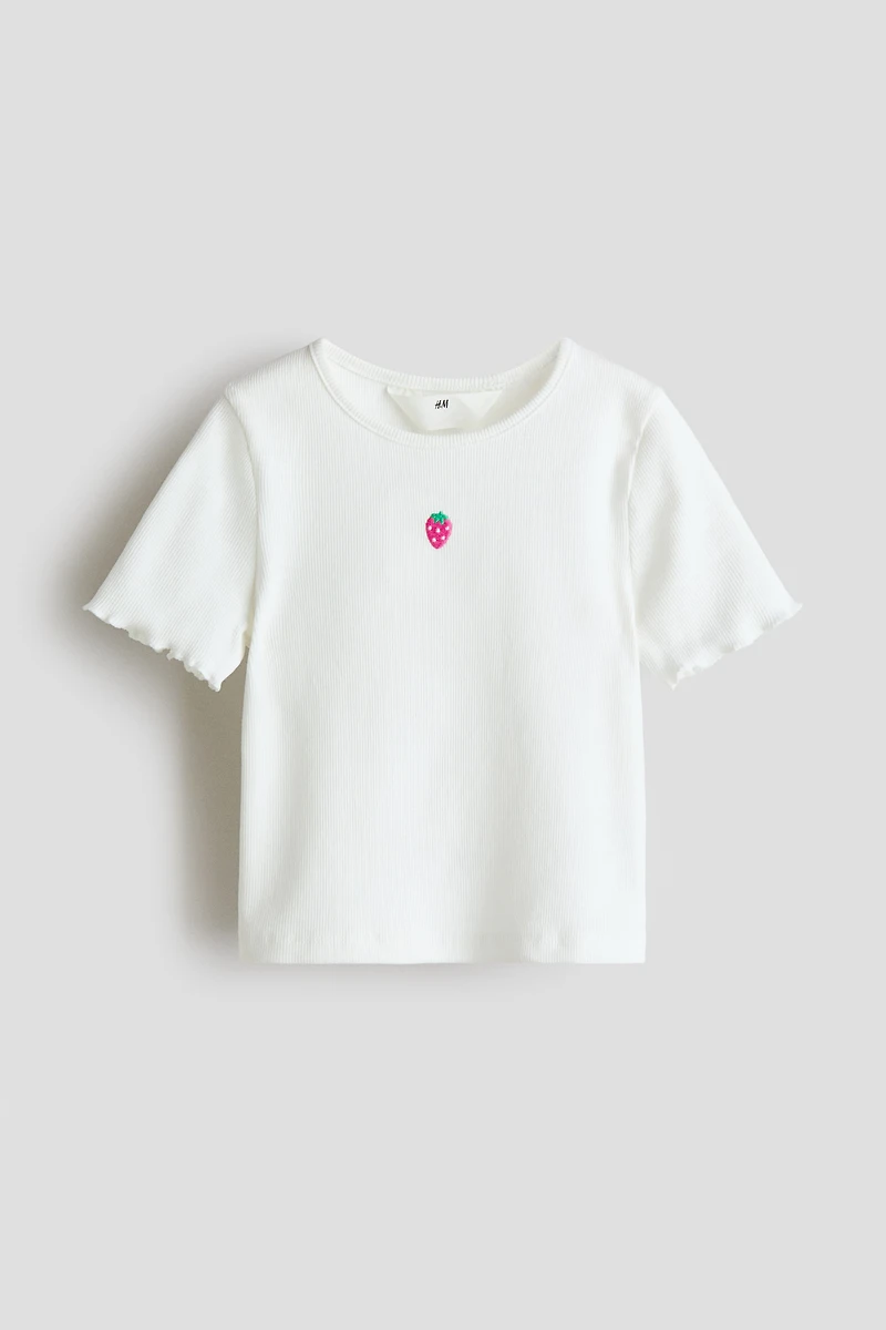 Top in ribbed cotton jersey. Round neckline and short sleeves with overlocked edges at cuffs.
