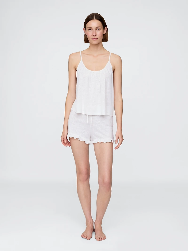Soft linen-blend pajama sleep shorts. Elasticized waist with drawcords. Ruffle hem. This product was made in a factory that invests in gender equity and women’s empowerment through RISE. Learn more at gapinc. com/equity.