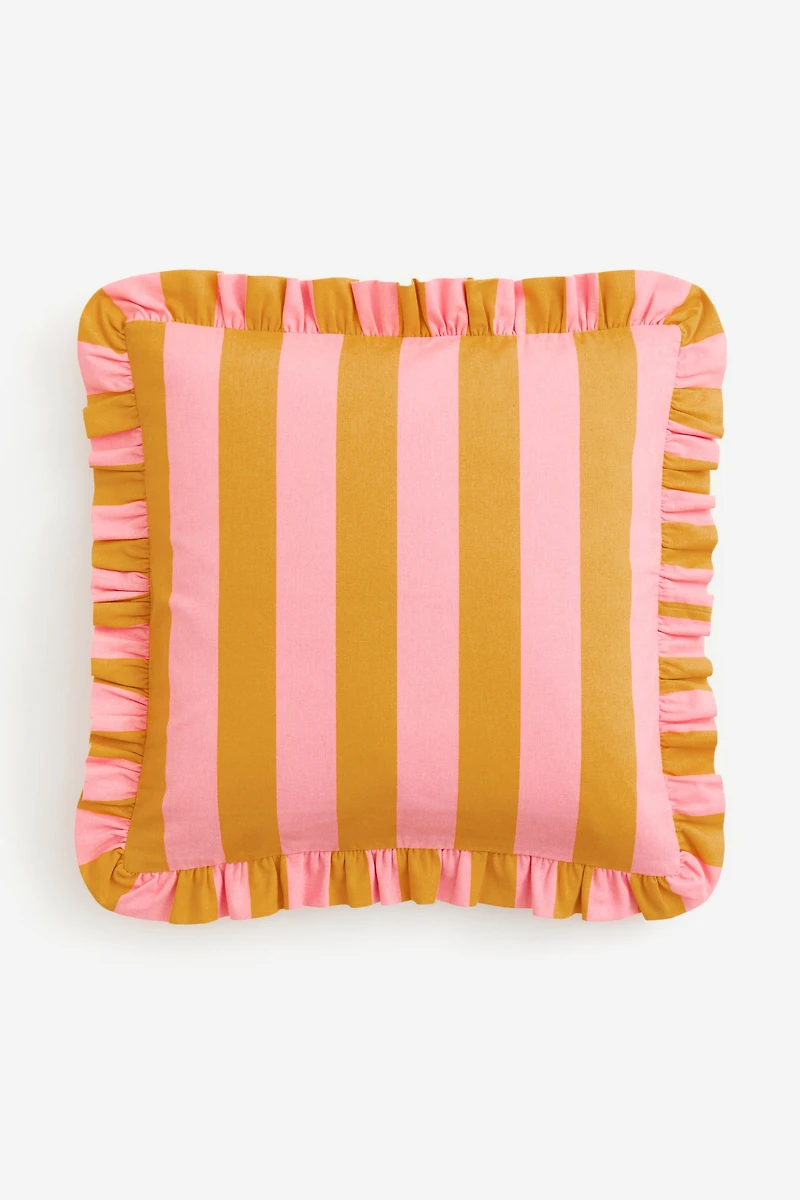 Cushion cover in striped, woven cotton fabric with ruffle trim. Concealed zipper at side.