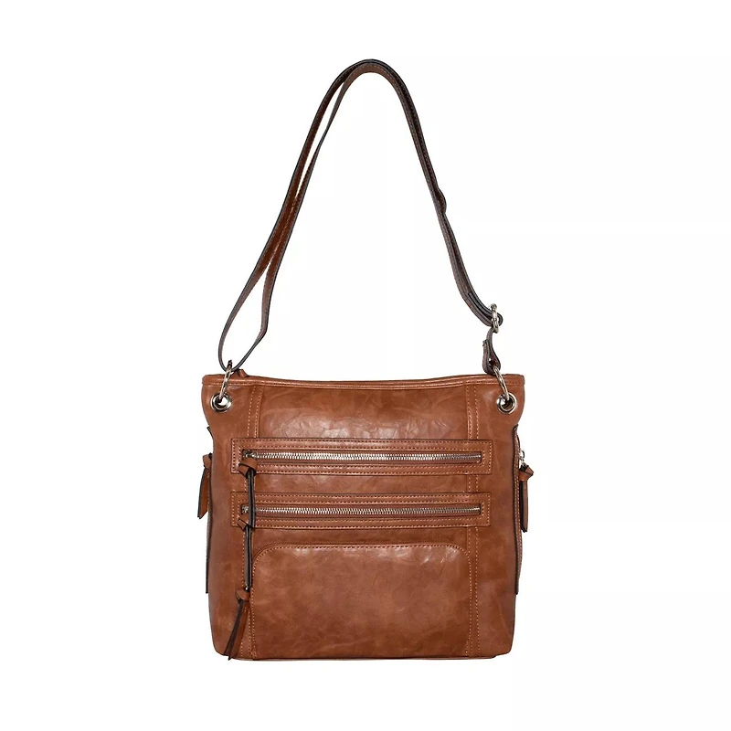 Treat yourself to this fashionable and fully functional Kelly and Katie Rustego PVC Multi Zip tan Crossbody. Crafted with a highly durable mixed material exterior, this casual bag boasts a roomy interior with top zippered closure, two zippered pockets, an adjustable shoulder strap for convenient transportation. This style is exclusive to Designer Brands Canada.