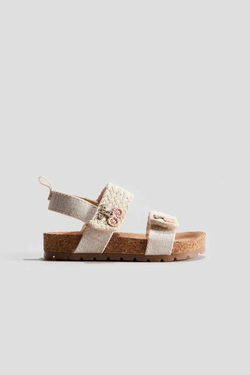Sandals in napped fabric. Adjustable foot and ankle straps with hook-loop fastening. Molded insoles and patterned soles. Sole thickness 3/4 in.