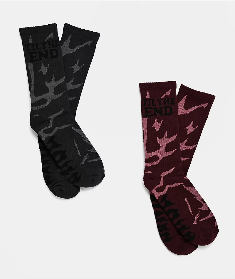 Provided by Santa Cruz Skateboards in a pack of two pairs, the Til The End crew socks offer a comfy, athletic design with one pair in grey and the other in brown. Decorated with jacquard-knit graphics of a sigil pattern throughout and bold text on th