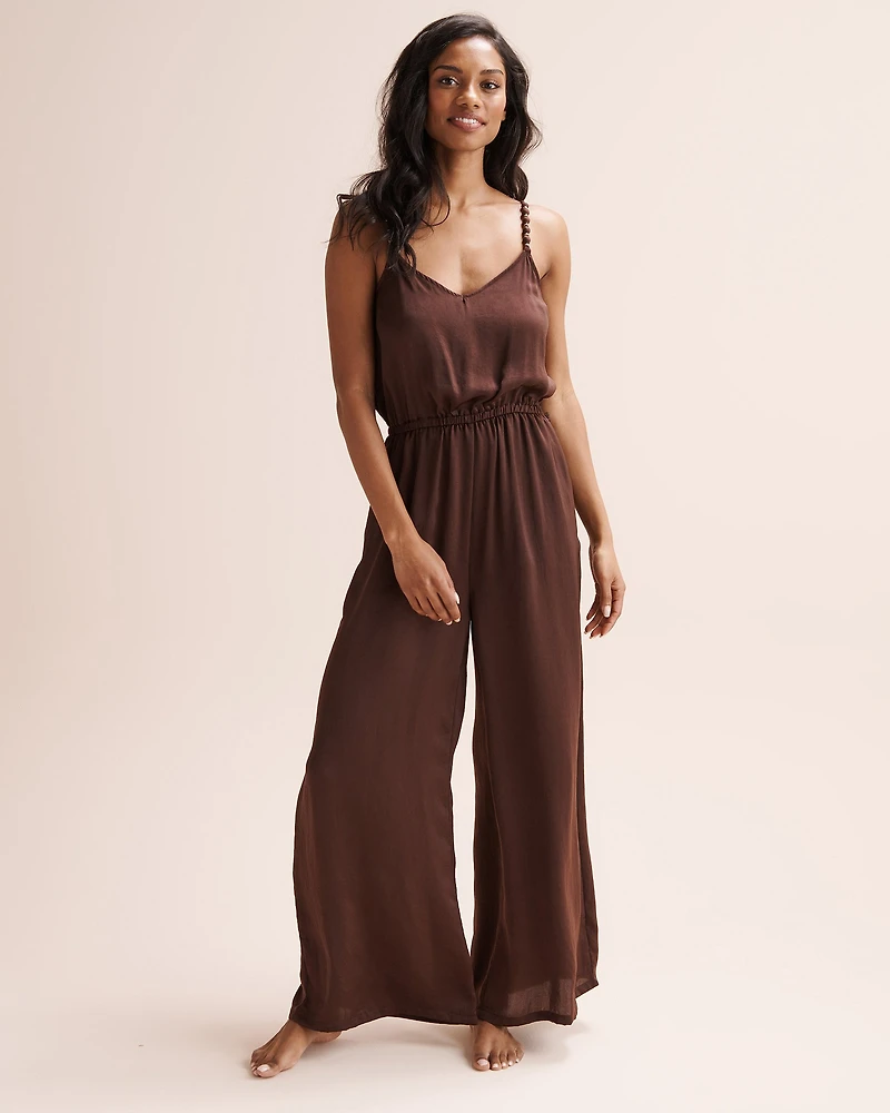 Slip into this brown satin jumpsuit and let it do all the work for you. The adjustable straps are adorned with gold-tone jewels, because a little sparkle never hurt anyone. Add to that the side pockets to keep your essentials within easy reach. A chic, practical, and shimmering piece, exactly what your wardrobe has been waiting for.