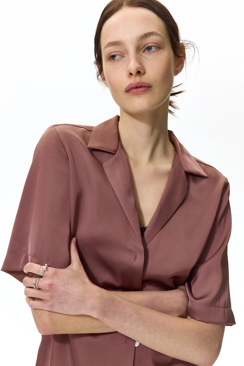 Short-sleeved shirt in softly draped satin. Resort collar, buttons at front, and a straight-cut hem with slit at sides.