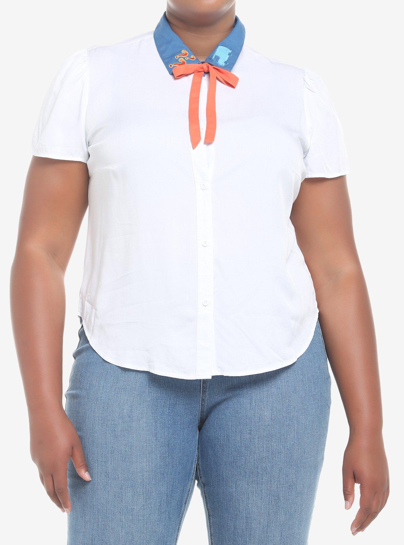 Let's split up, gang! Step into the Mystery Machine with the cutest top on. From Scooby-Doo! , this woven button-up is inspired by Fred, with question marks and the van embroidered on the collar, and a orange ribbon tie inspired by his ascot.