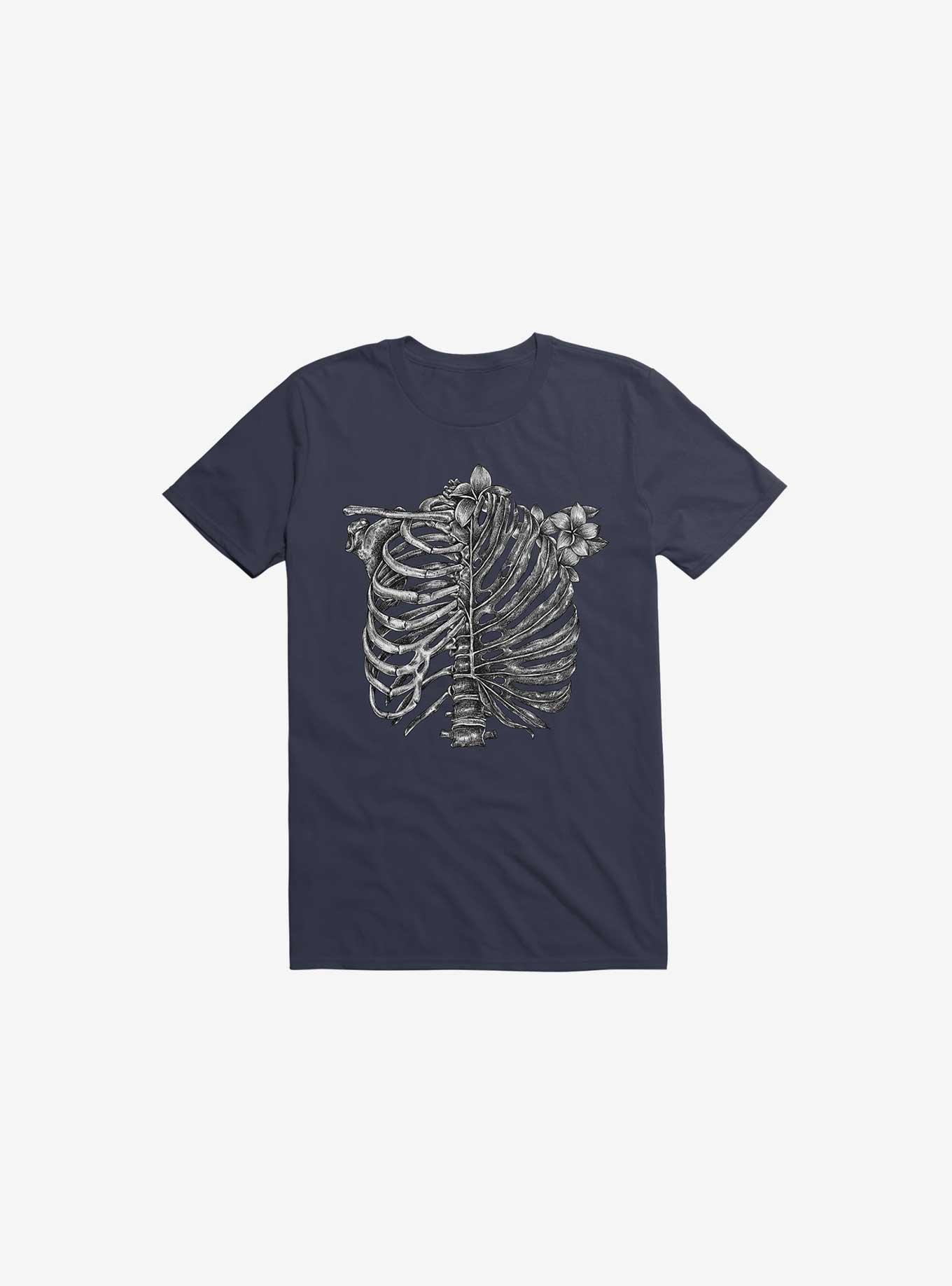 Bones to blooms. This lightweight navy blue tee has a graphic that's half ribcage, half tropical plant. Officially licensed art from alanmaia.