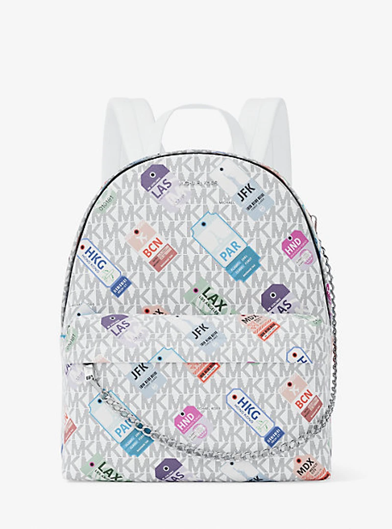 Backpack, logo-print canvas, 90% coated canvas/10% polyester, trim: 85% acrylic/15% polyester, gold-tone hardware, 10. 5”w x 13. 25”h x 6”d, handle drop: 2. 25”, exterior details: front zip pocket, interior details: back zip pocket, lining: 100% polyester, zip fastening, imported
