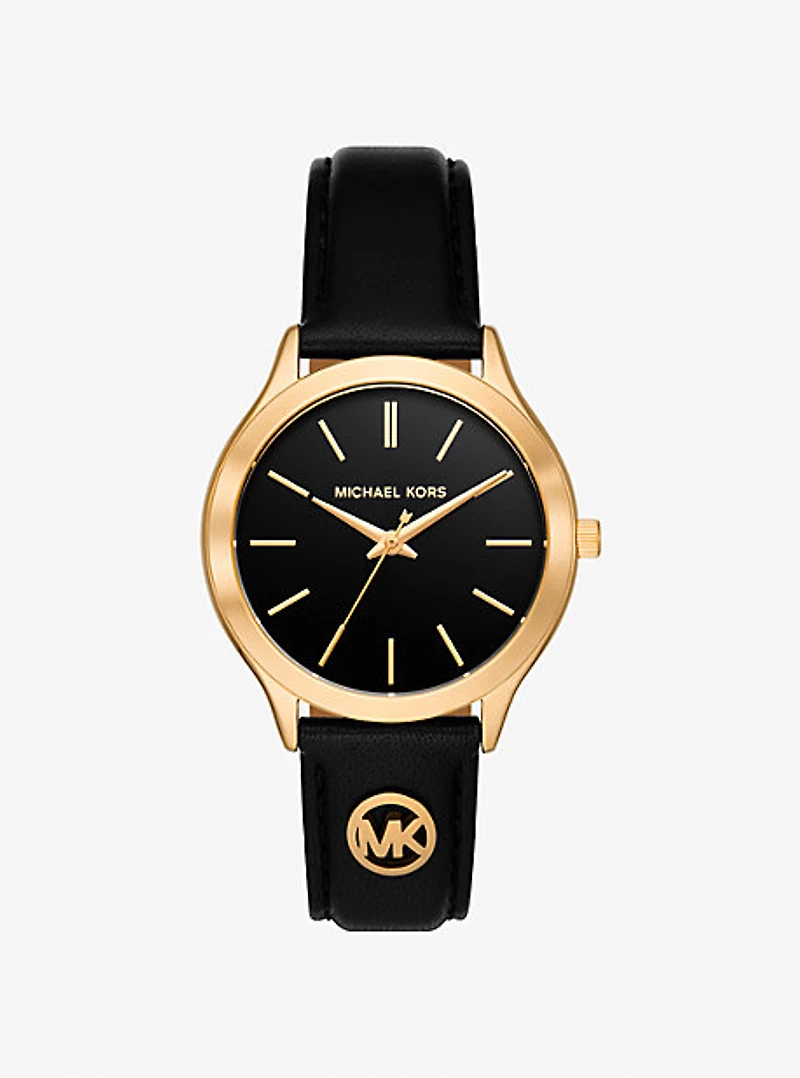 Our coveted slim runway watch is reimagined with a versatile leather strap for modern appeal. Designed with a sleek minimalist dial, it features gold-tone hardware to add a gilded touch to your favorite looks. Stack it with an arm full of complementing jewelry on off-duty days, or slip it on as its own standout piece when you’re headed to the office.