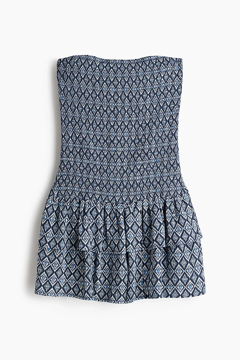 Short bandeau dress in woven fabric. Concealed elastic at upper edge, a smocked, fitted bodice, and a gently flared skirt with flounced tiers. Liner shorts in jersey.