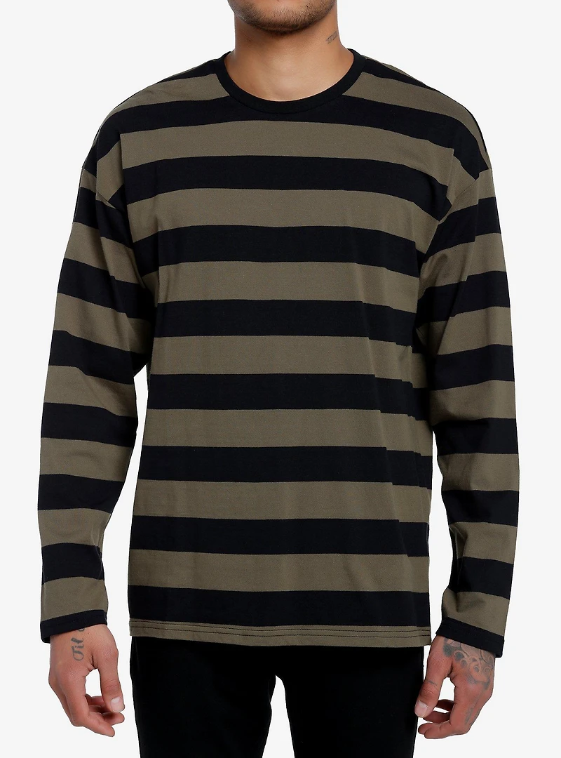 Add some more must-have essentials to your wardrobe with this long-sleeve! This olive and black long-sleeve tee has wide stripes throughout, and comes in a relaxed fit with drop shoulders.