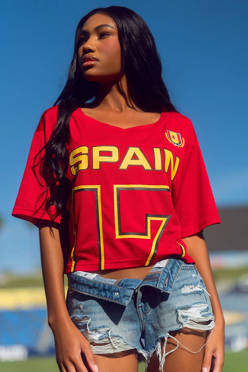 This jersey features mesh material, graphic front, V-neckline, short sleeves, and cropped hem.