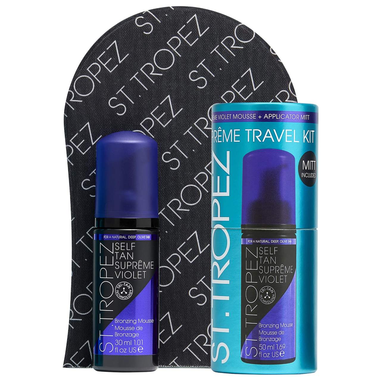 A travel-friendly size of Self Tan Suprême Violet for on the go. Skin Type: Normal, Dry, Combination, and Oily Skincare Concerns: Uneven Tone Formulation: Cream Highlighted Ingredients:- Aqua (Water): St Tropez's deepest tan. - Dihydroxyacetone: Innovative violet base balances tones for rich olive tan. - Caramel: Flawless results-streak-free and quick drying. Ingredient Callouts: These products are vegan. What Else You Need to Know: The unique violet-tint base balances the tones of your tan for