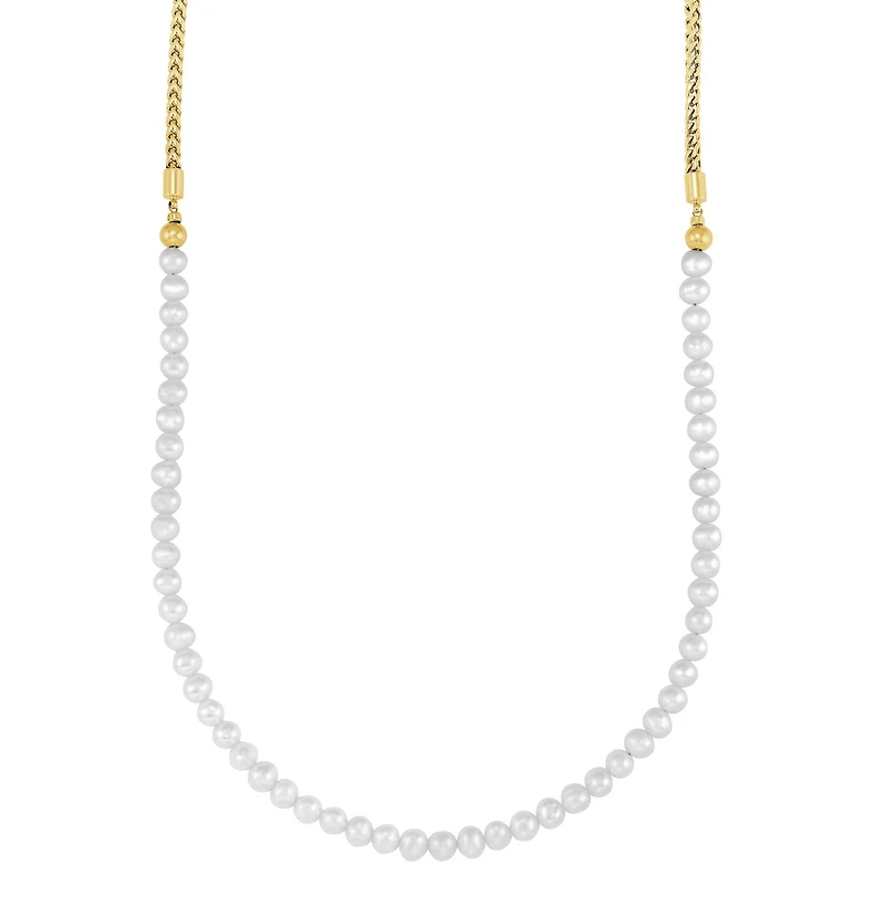The robust and sleek stainless steel Franco chain provides a modern backdrop to the timeless elegance of pearls. This juxtaposition creates a stunning contrast that elevates any look, blending the resilience of stainless steel with the soft, lustrous beauty of pearls. The result is a unique and versatile piece that exudes both strength and refinement, perfect for those who appreciate a blend of boldness and timeless charm in their accessories.