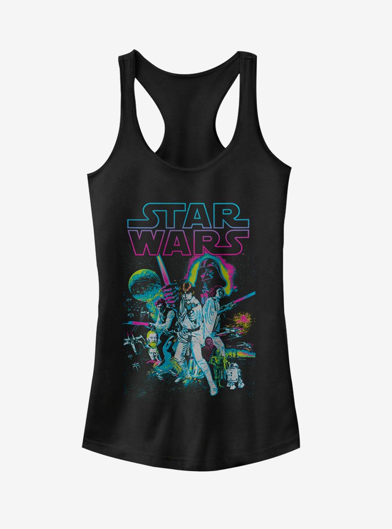 Relive the excitement of when the first Star Wars film was released with this black A New Hope racerback tank. This soft and breathable top features the artwork from one of the original Star Wars posters printed in fun colors.