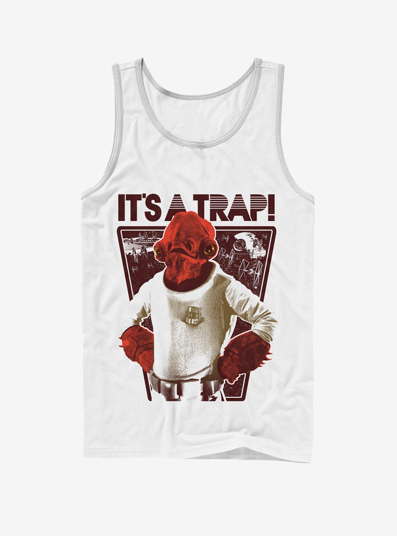 Admiral Ackbar and his famous line from the Battle of Endor are the starring features of the Star Wars Ackbar It's a Trap White Tank Top. "It's a trap!" is printed at the top of this awesome white muscle tee, with Akbar posing below. 100% Cotton.