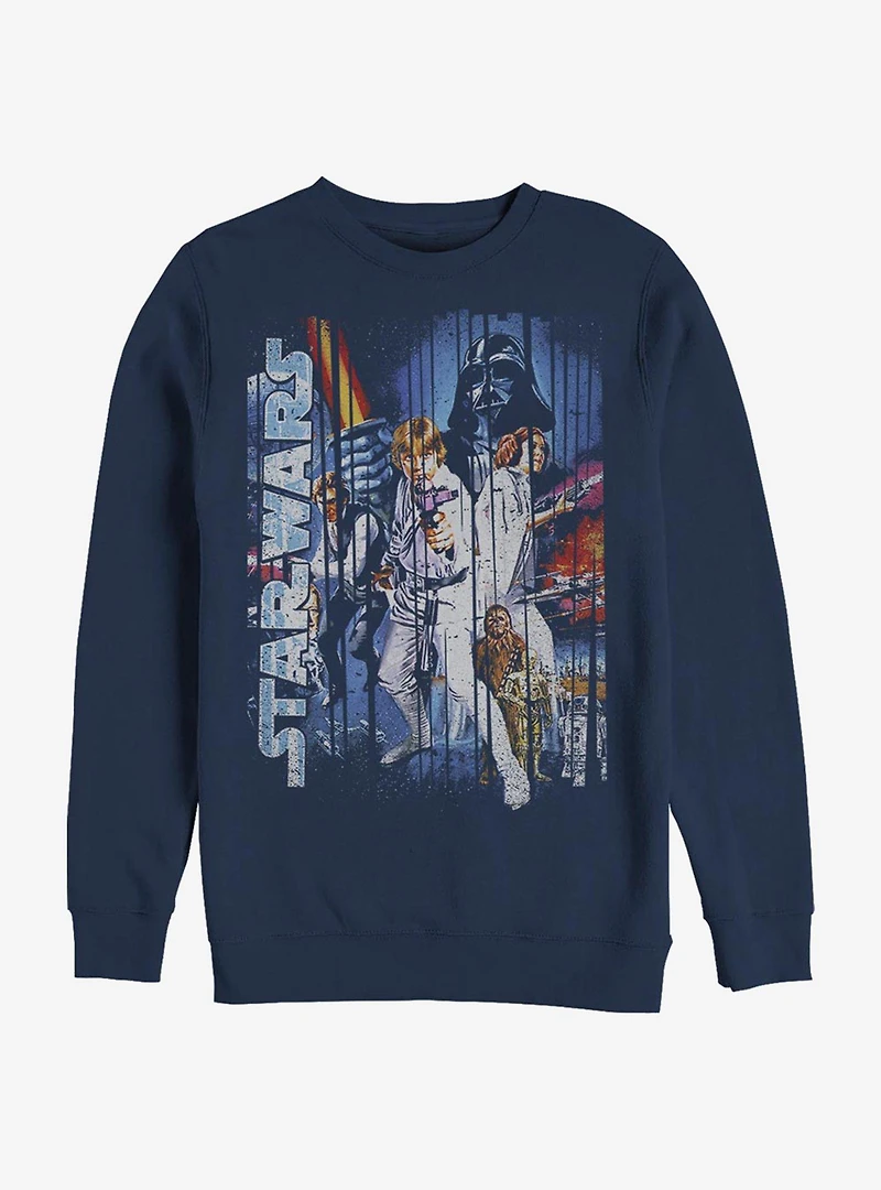 Classic Star Wars poster art meets a vintage-style crewneck. This navy blue sweatshirt features the film logo along with iconic characters like Darth Vader, Luke Skywalker, Princess Leia, Han Solo and more.