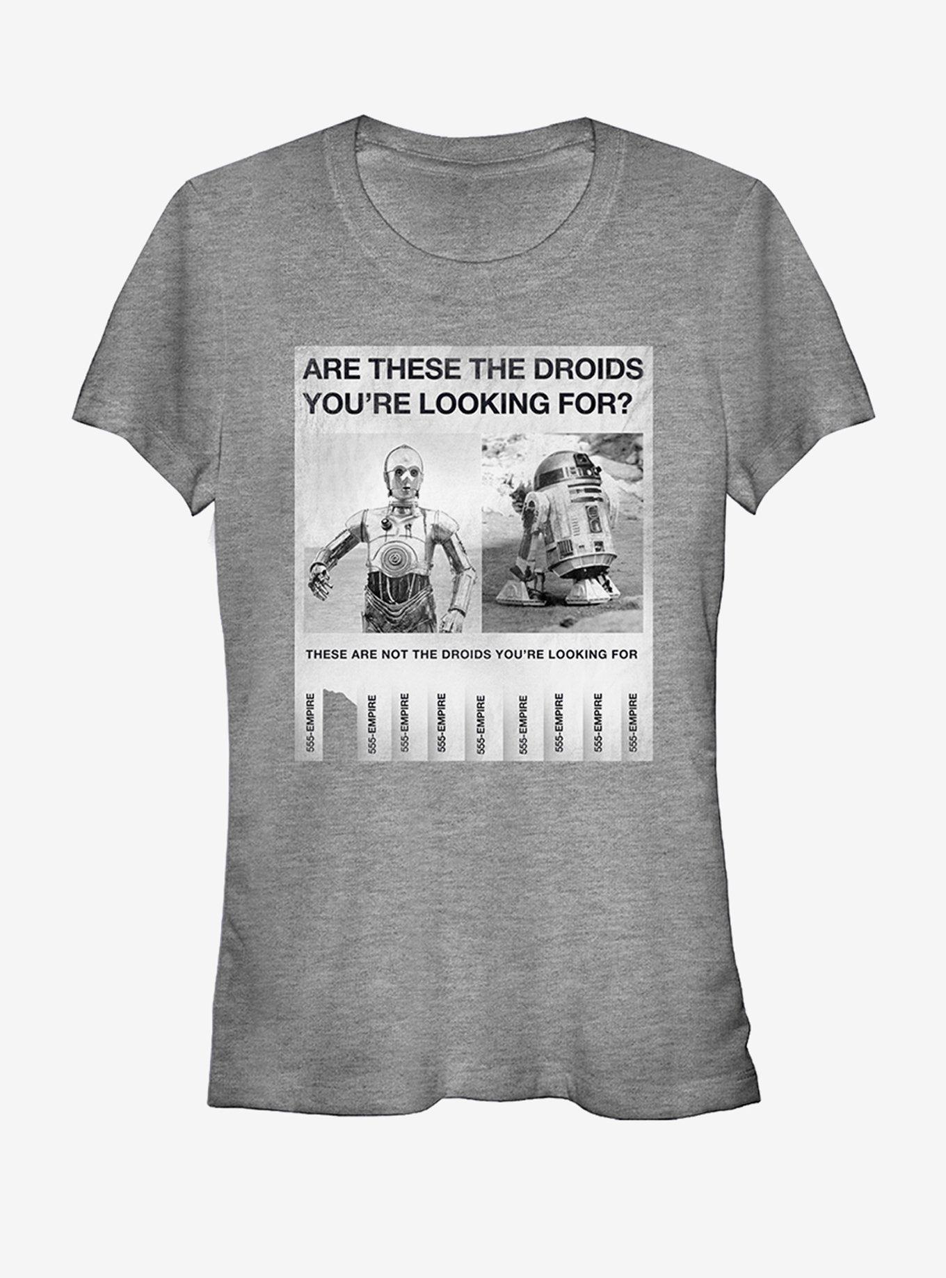 Been looking for droids in Alderaan places? Next time, start with the Star Wars Droid Poster Heather Gray T-Shirt. C-3PO and R2-D2 are featured in a poster-style print on this fitted gray shirt that just might pull off a jedi mind trick. 90% Cotton, 10% Polyester. Runs small, size up