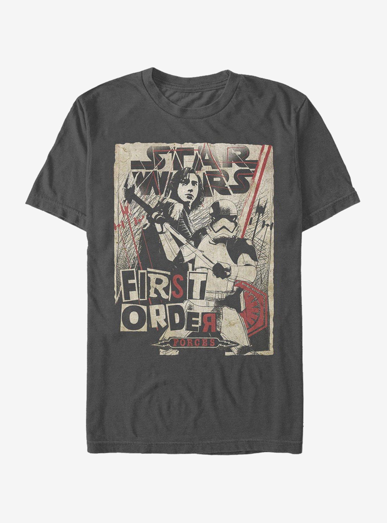 We've all seen Kylo Ren's temper so you better not get between him and his Star Wars The Last Jedi First Order Forces Charcoal Gray T-Shirt! A distressed sketch-style poster shows Kylo Ren and a First Order stormtrooper alongside "Star Wars First Order Forces" down the front of this unique Episode 8 shirt. 100% Cotton.