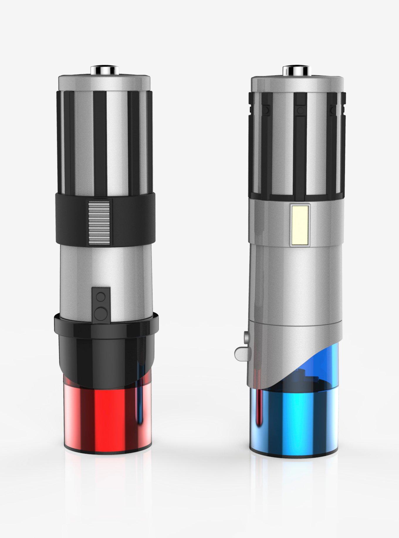 Not as clumsy or random as a regular salt and pepper shaker, these elegant lightsaber grinders have a ceramic mechanism you can adjust from fine to coarse. These mills are made from high-quality stainless steel, and their exteriors are durable ABS plastic molded to look like your favorite Jedi weapon. Each runs on four AA batteries (not included). Set of two grinders - one red and one blue. Not dishwasher safe. Grinds peppercorns and salt with the touch of a button, guiding light turns on automatically while dispensing. Each mill is 8 3/4" H X 2" diam.
