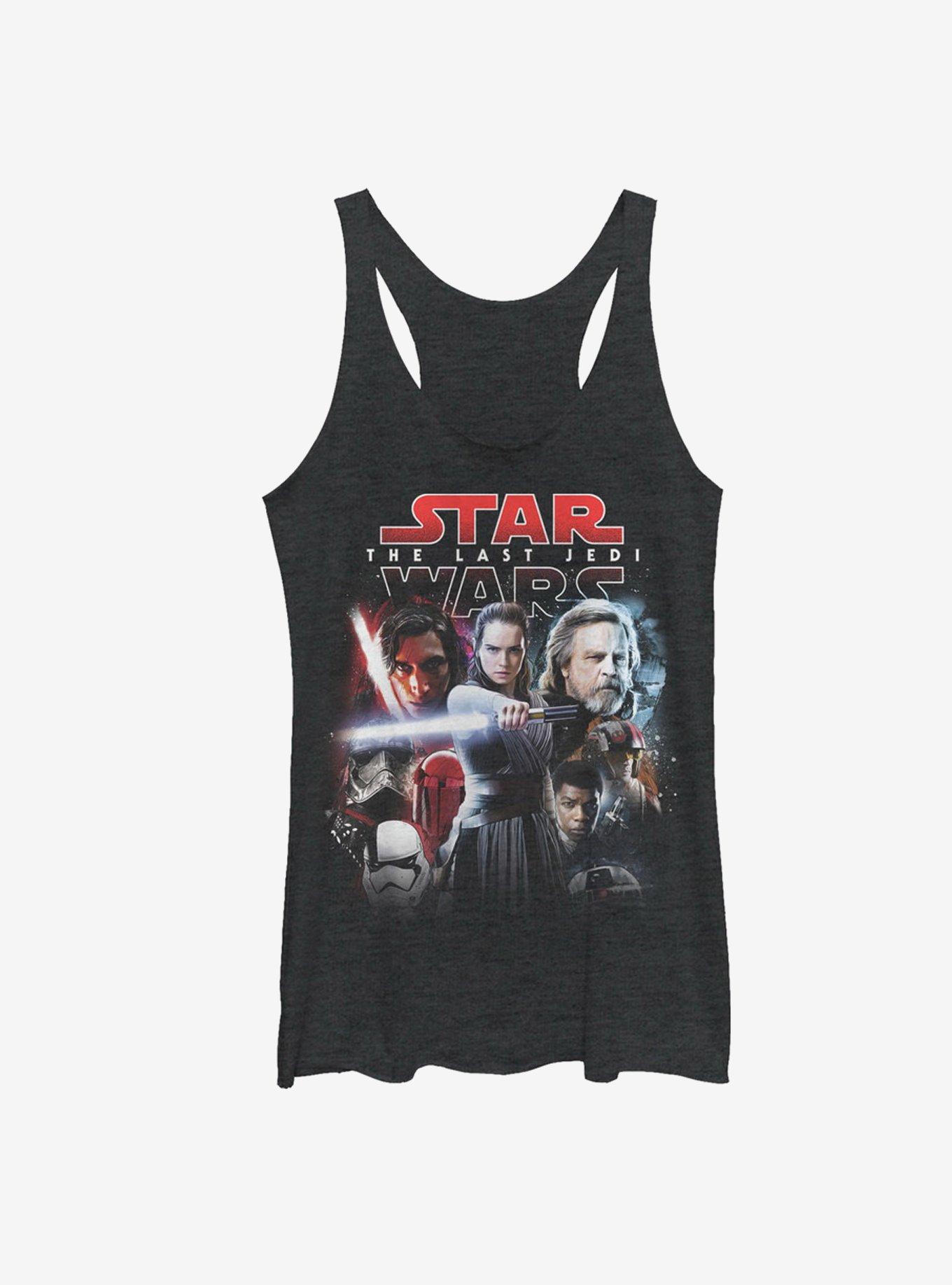 Luke Skywalker has been in hiding for years, but lucky for you we've found him on the Star Wars The Last Jedi Movie Poster Style Heather Black Racerback Tank Top! All of your favorite characters like Rey, Kylo Ren, Finn, Poe, and Luke Skywalker are featured in an epic movie poster style across this soft Episode 8 tank top. 50% Polyester, 25% Cotton, 25% Rayon.
