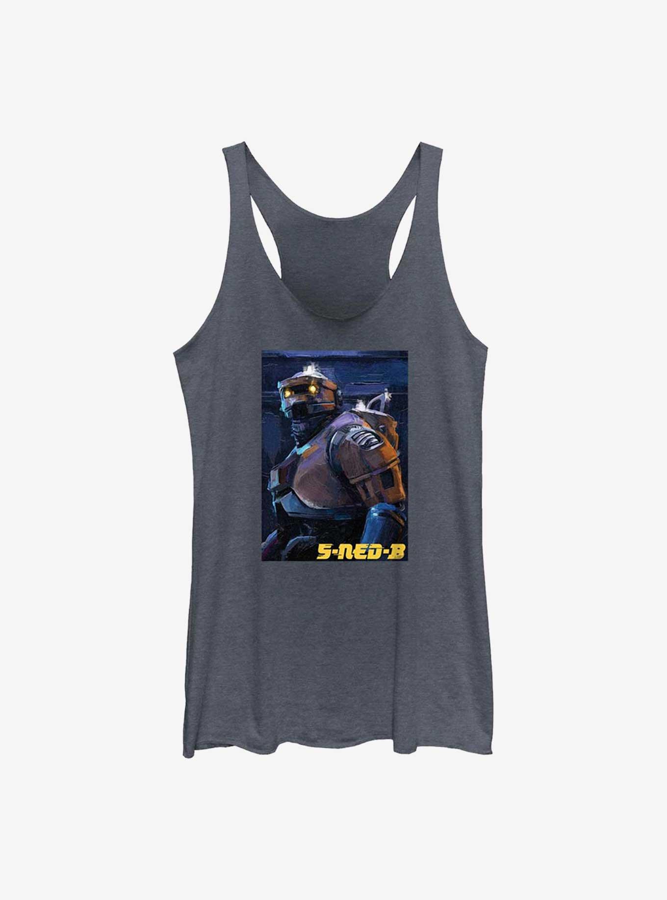 This droid just saved the day! Our heathered navy blue racerback tank features a painting of 5-Ned-B from the Disney+ series Star Wars: Obi-Wan Kenobi .