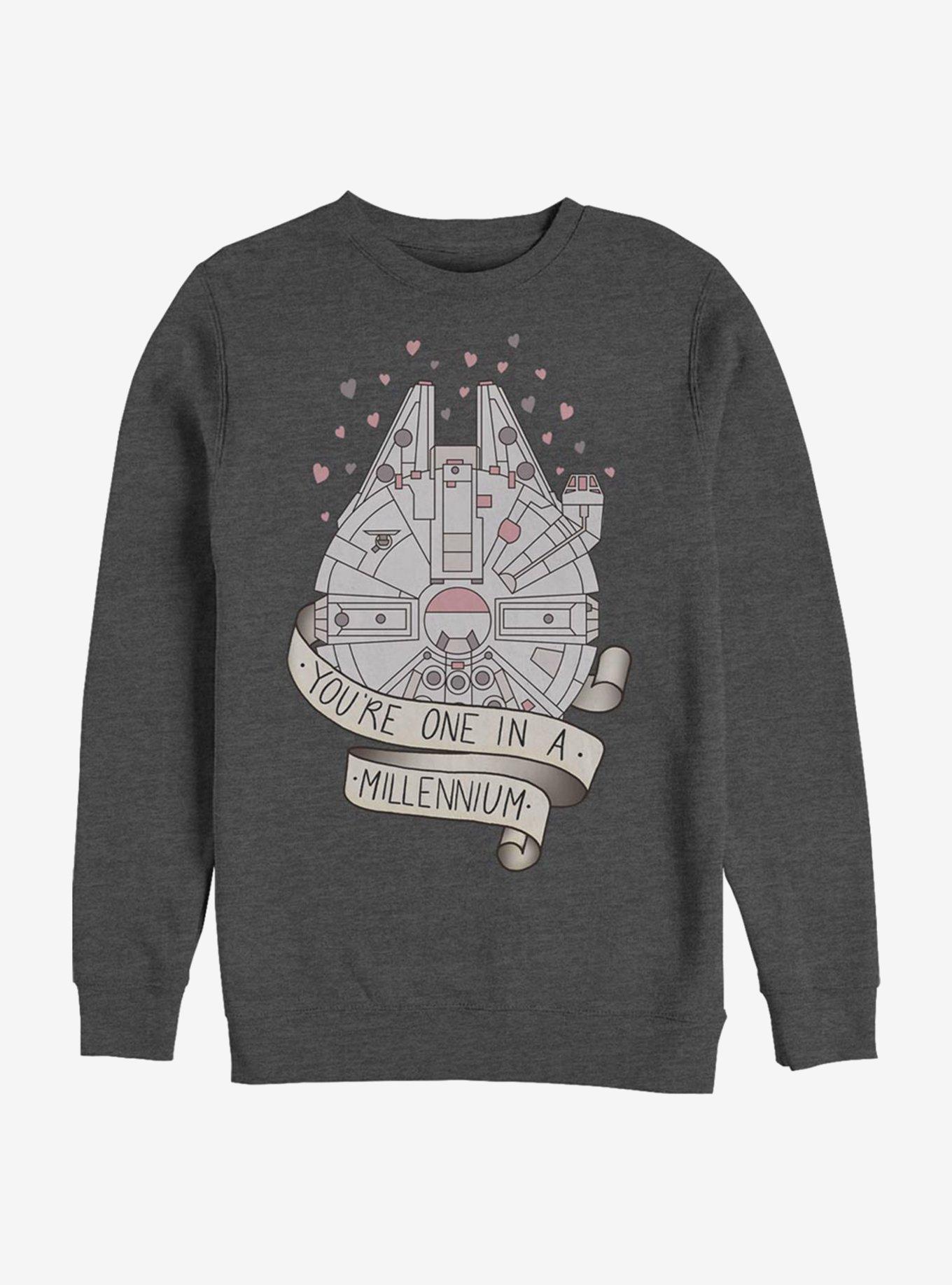 You're one in a Millennium! This heathered charcoal grey crewneck sweatshirt features iconic ship the Millennium Falcon alongside hearts and a special greeting for your Star Wars -loving sweetie.