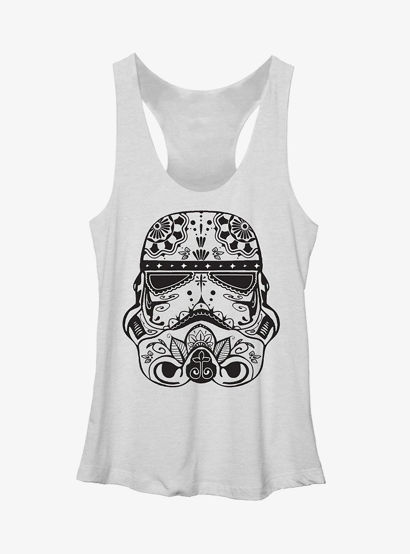 The stormtrooper helmet has come to be a symbol of evil and villainy, but it's looking rather lovely on the Star Wars Ornate Stormtrooper Heather White Racerback Tank Top. This cute white shirt features an artistic and ornate print of the iconic stormtrooper helmet, giving it a Day of the Dead twist. 50% Polyester, 25% Cotton, 25% Rayon.