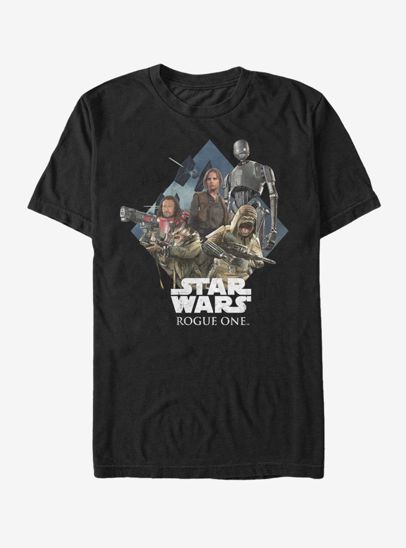 Join forces with Mon Mothma to get your hands on the Star Wars Rogue One Rebel Cube Black T-Shirt! Mon Mothma's band of heroes like Jyn, Baze, Pao, Bistan, and K-2SO are displayed within a cube border on this cool black Rogue One shirt. 100% Cotton.
