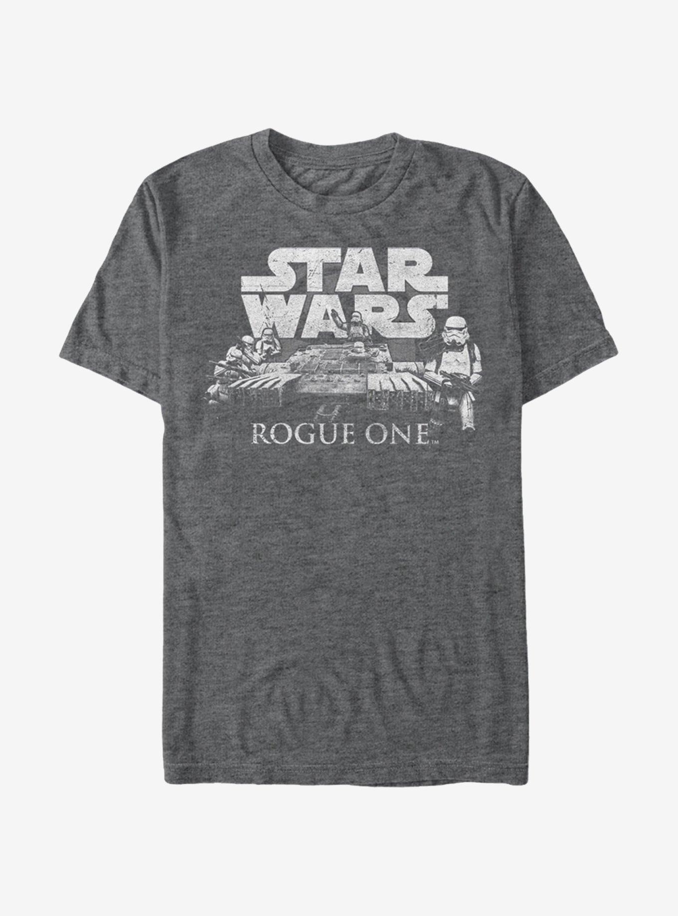 Available for purchase: September 30 You'll need your Star Wars Rogue One Stormtrooper Tank Scene Logo Heather Charcoal T-Shirt because it's up to you to save the galaxy! A distressed graphic portrays a group of stormtroopers and a Tank Trooper heading into battle on a tank on this cool gray Rogue One shirt. 60% Cotton, 40% Polyester.