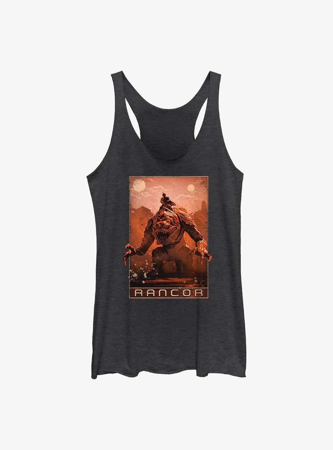 Your other ride is a... rancor. Show 'em how you get around with this heather black racerback tank -- inspired by the Disney+ series Star Wars: The Book of Boba Fett -- that features the legendary bounty hunter on top of the iconic reptilian beast.