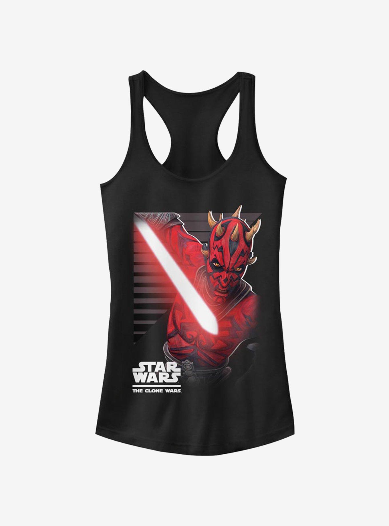 The iconic red blade. This black racerback tank -- inspired by Star Wars: The Clone Wars -- features Maul holding his lightsaber.