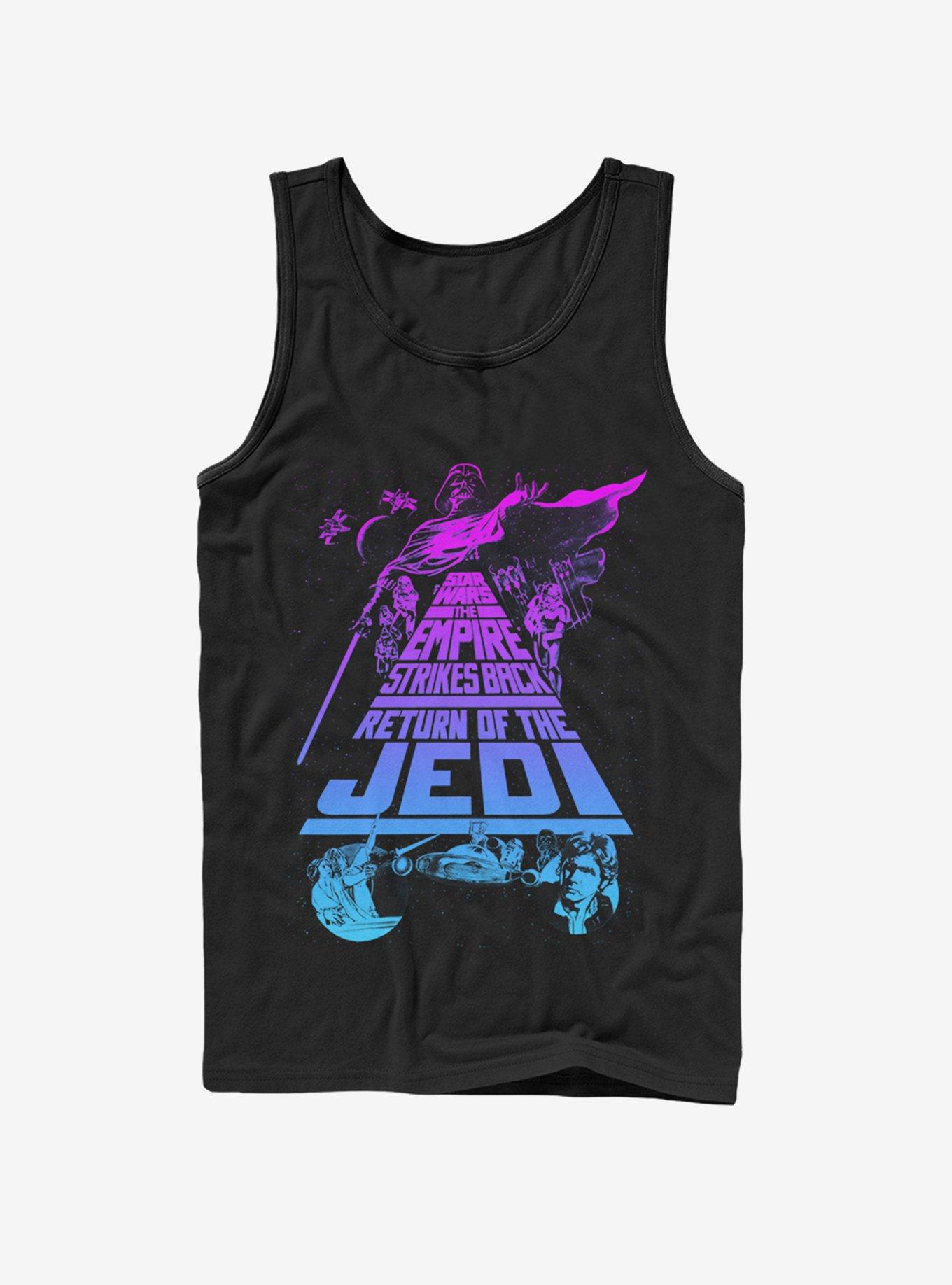 Commemorate the trilogy that started it all with the Star Wars Trilogy Black Tank Top. The titles of the three original films are printed in the style of the opening lines on this awesome black tank top, with characters like Darth Vader and Princess Leia printed around the edges. 100% Cotton.