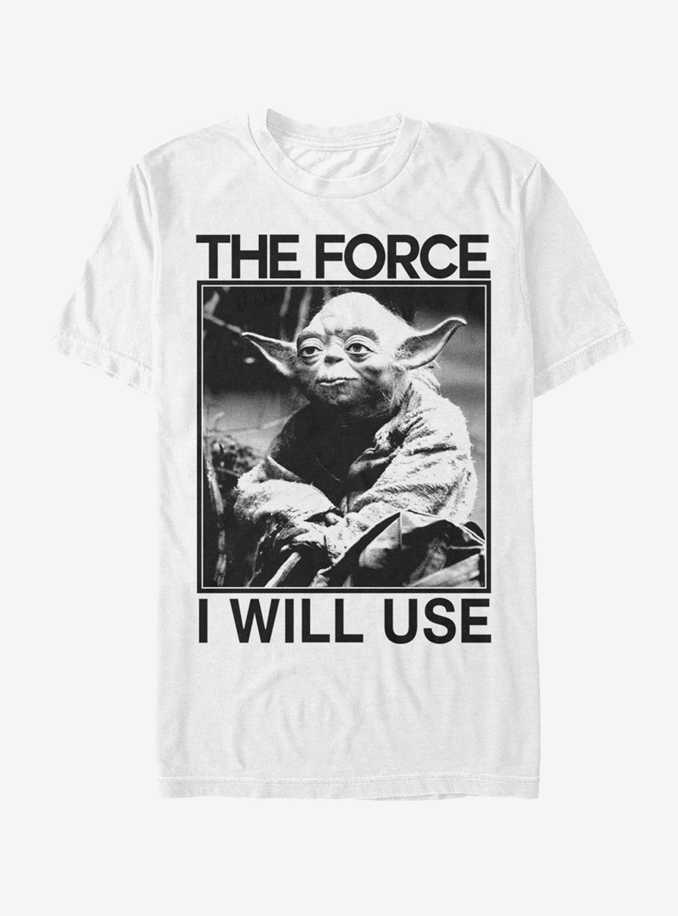 Take the advice of a wise old Jedi Master and start rocking the Star Wars Yoda Use the Force White T-Shirt! A black and white picture of Yoda is printed on the front of this awsome white tee with "The Force I Will Use" in black around it. 100% Cotton.