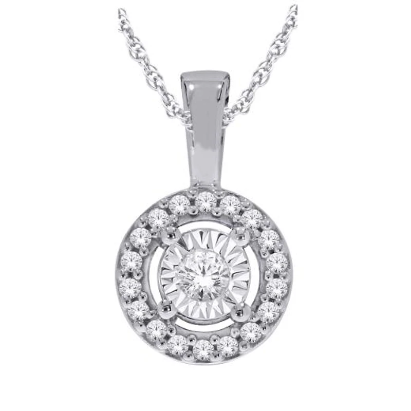 Suspended from a sterling silver chain, the pendant gracefully rests against your chest, accentuating your neckline with elegance. Its delicate size and captivating beauty make it an ideal piece for both daily wear and special events. The Sterling Silver 0.10CTW Diamond Halo Pendant is a symbol of refined style and grace. Wear it with confidence and let its shimmering allure be a reflection of your own unique charm and sophistication.
