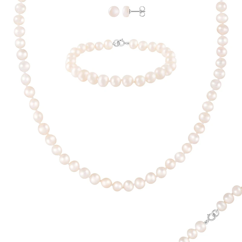 Sterling Silver 6-7mm White Freshwater Pearl Necklace, Bracelet and Earrings Set