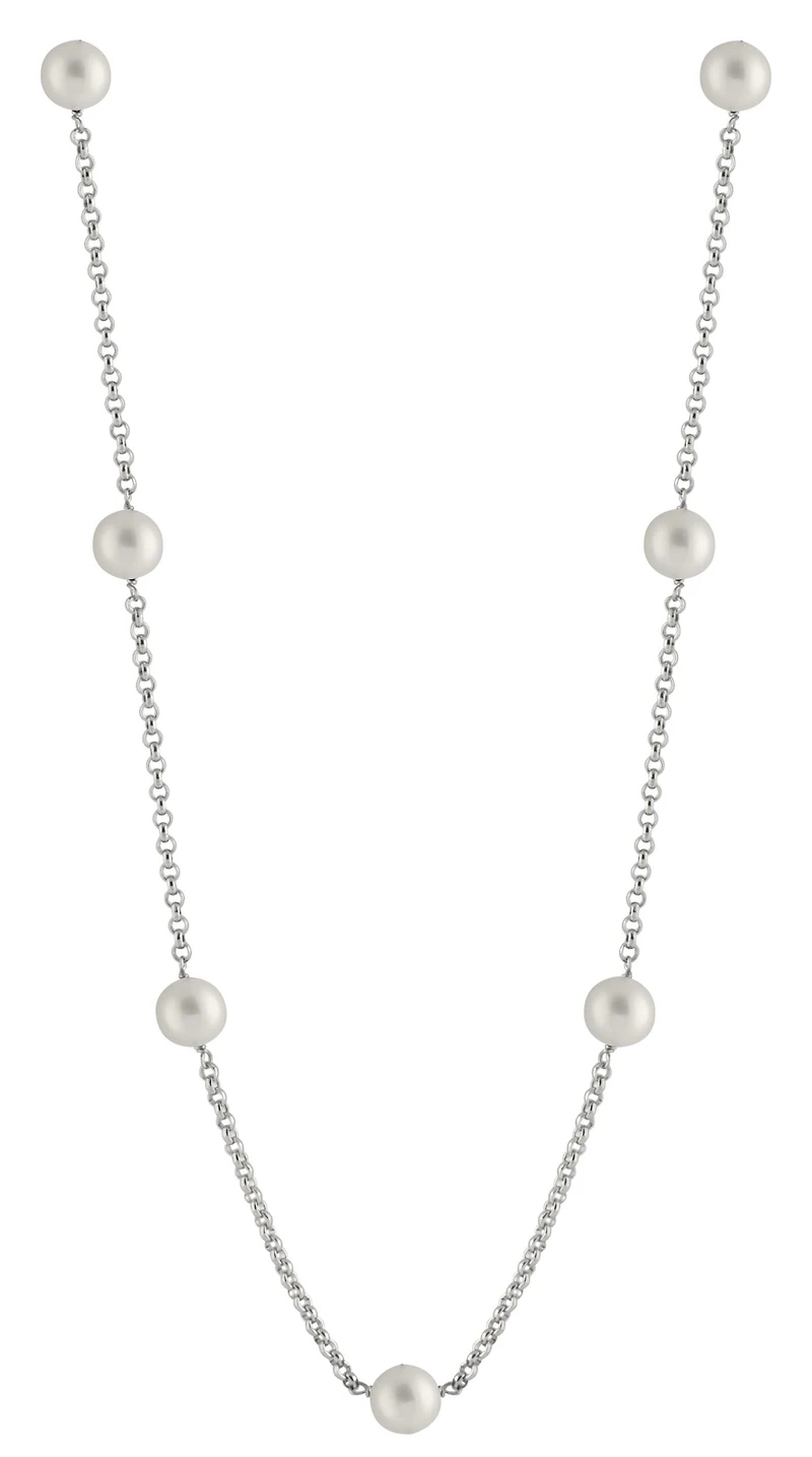 This sterling silver necklace features 8-9mm white freshwater pearls, known for their lustrous, elegant sheen. The 20-inch length provides a graceful drape, perfect for layering or wearing alone.