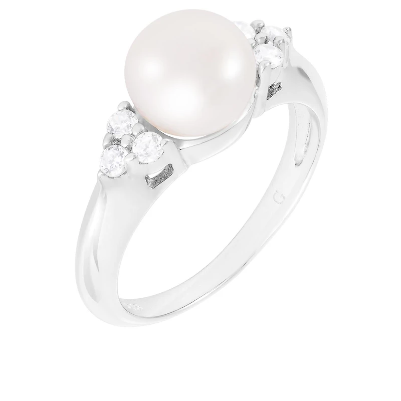 This ring features a lustrous freshwater pearl measuring 8.5-9mm in size, delicately accented by shimmering cubic zirconia stones. Each element adds its own unique allure, with the pearl exuding natural beauty and sophistication, while the cubic zirconia stones provide a touch of brilliance and glamour.