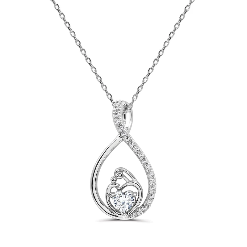 A beautiful symbol of the unbreakable bond, this sterling silver mother-and-child pendant is delicately accented with created white sapphires. Elegant and meaningful, it captures the essence of love and connection, making it a heartfelt piece to cherish forever.